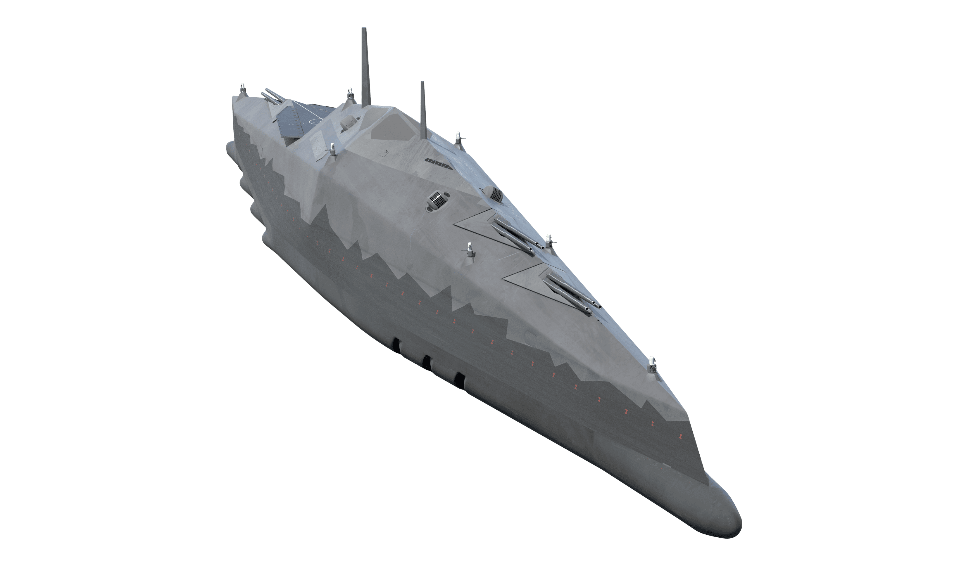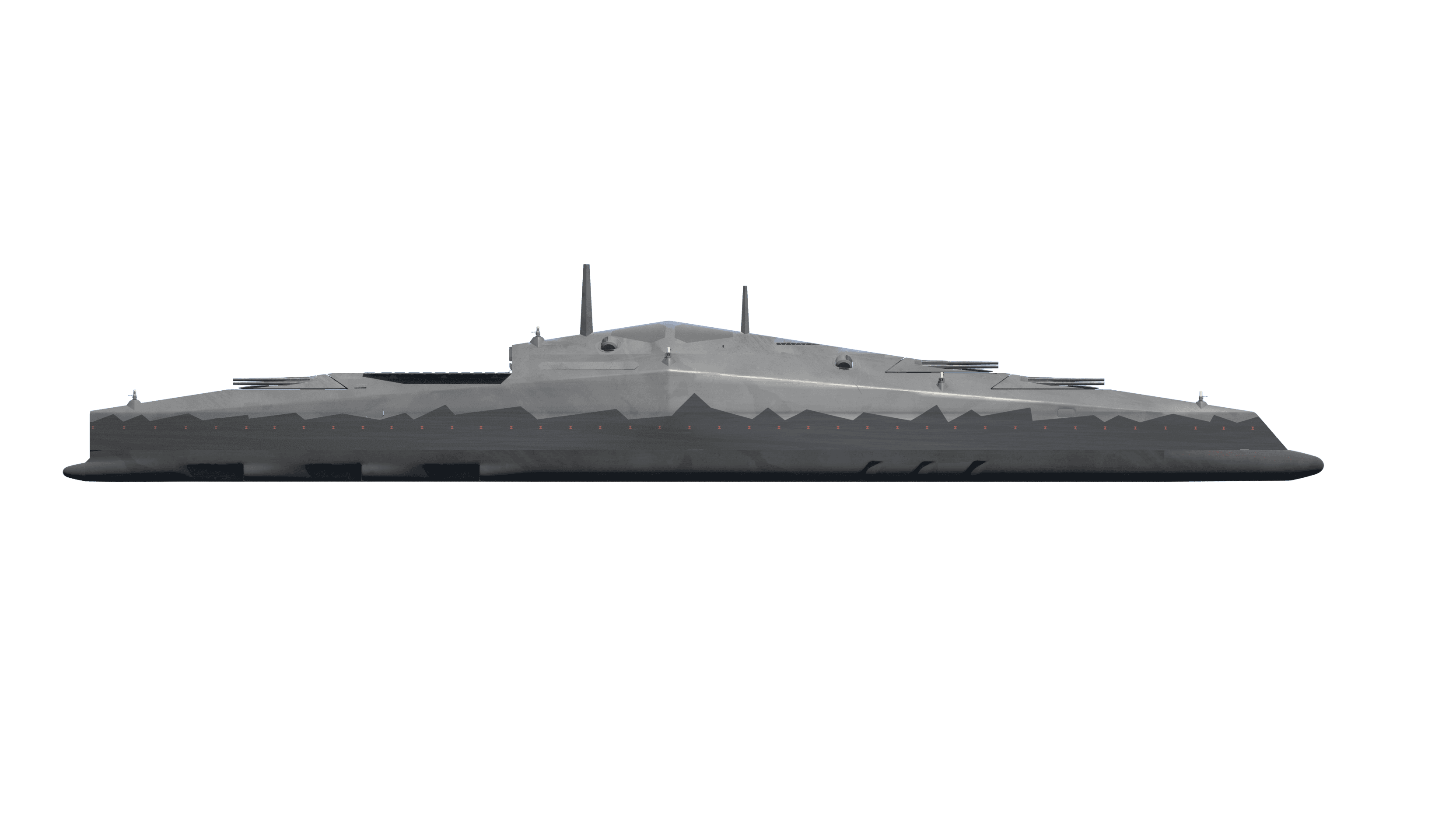 Modern Battleship adaptation. Main superstructure and hull are furhger integrated to reduce concavities and cross section. Main guns and superstructure utilize a very literal pyramidal shape, and are more thorougly conformal that the previous Teton systems.