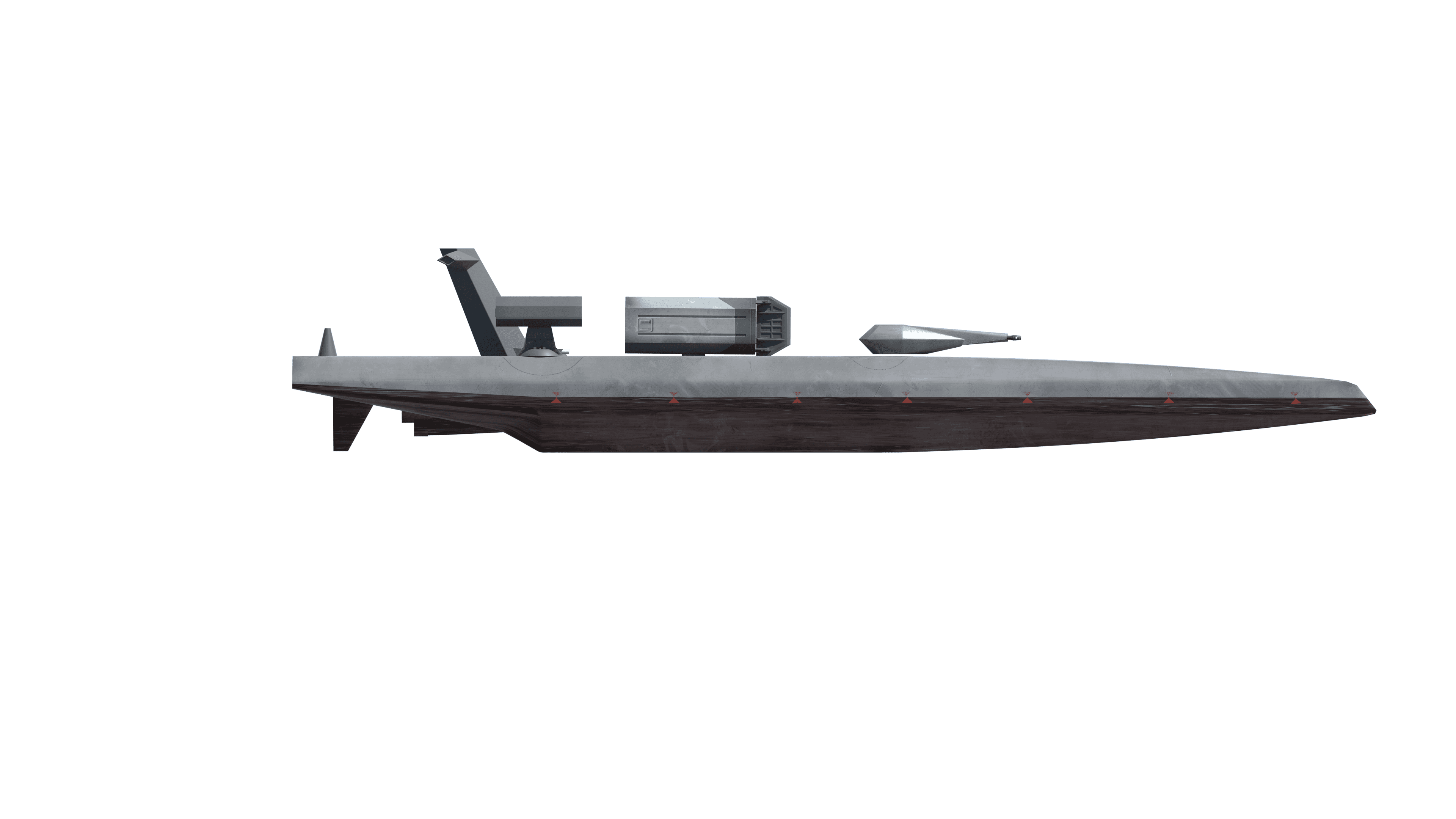 Medium sized unmanned ship with unique, aggressive twin hull configuration for maintaining stability, high speed and semi-submersibility. Great small platform for what might be considered an oversized main gun.