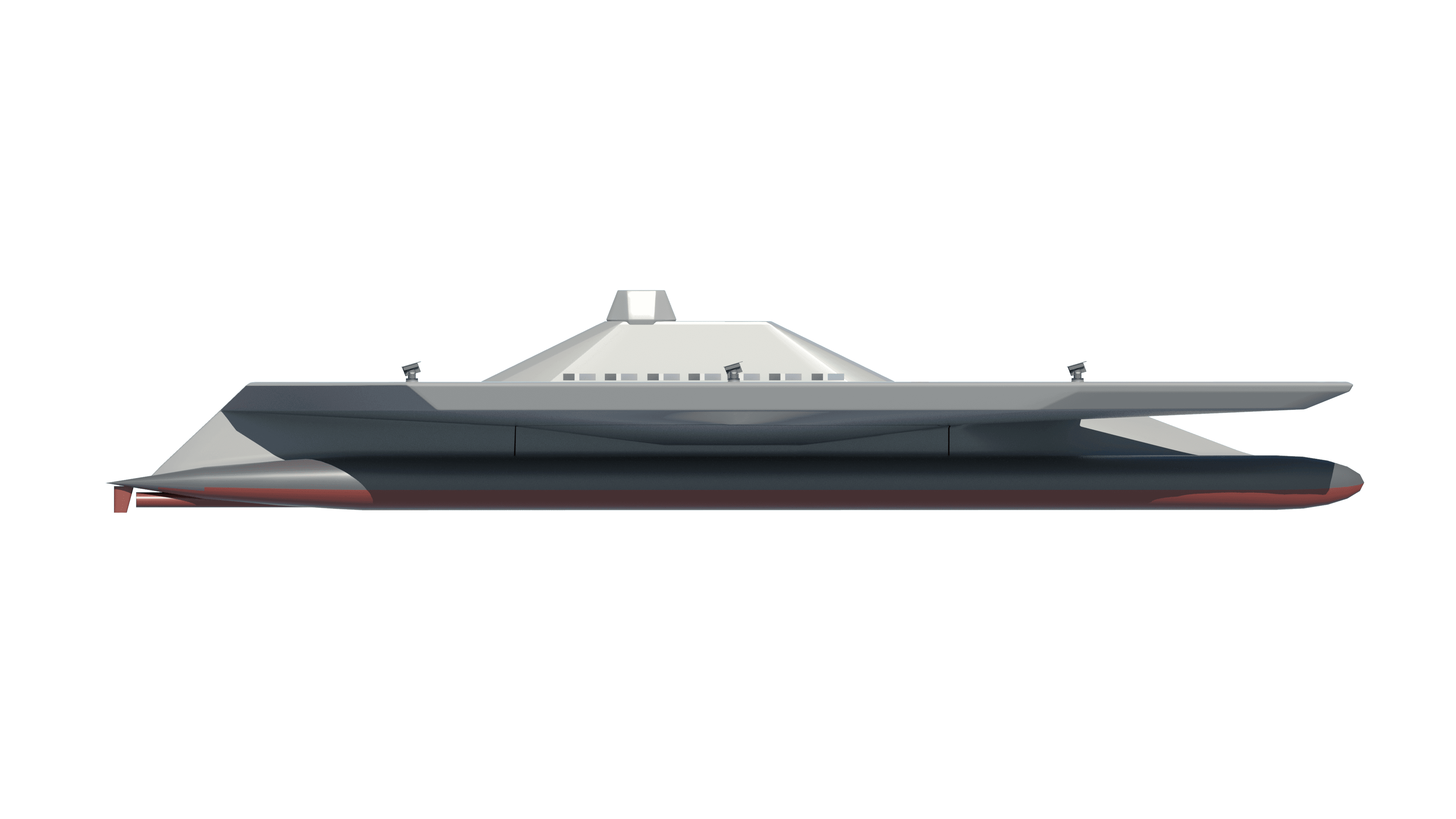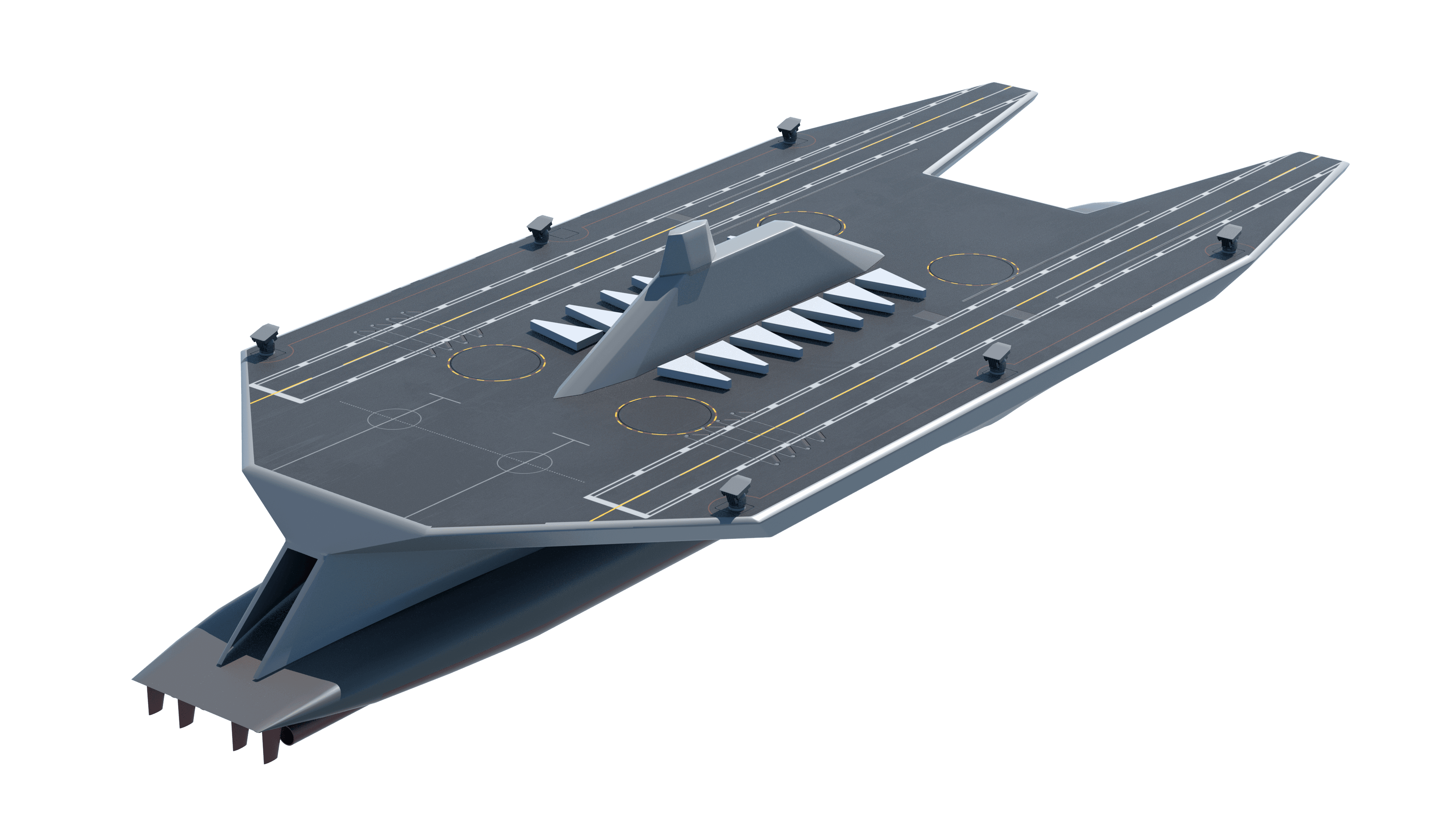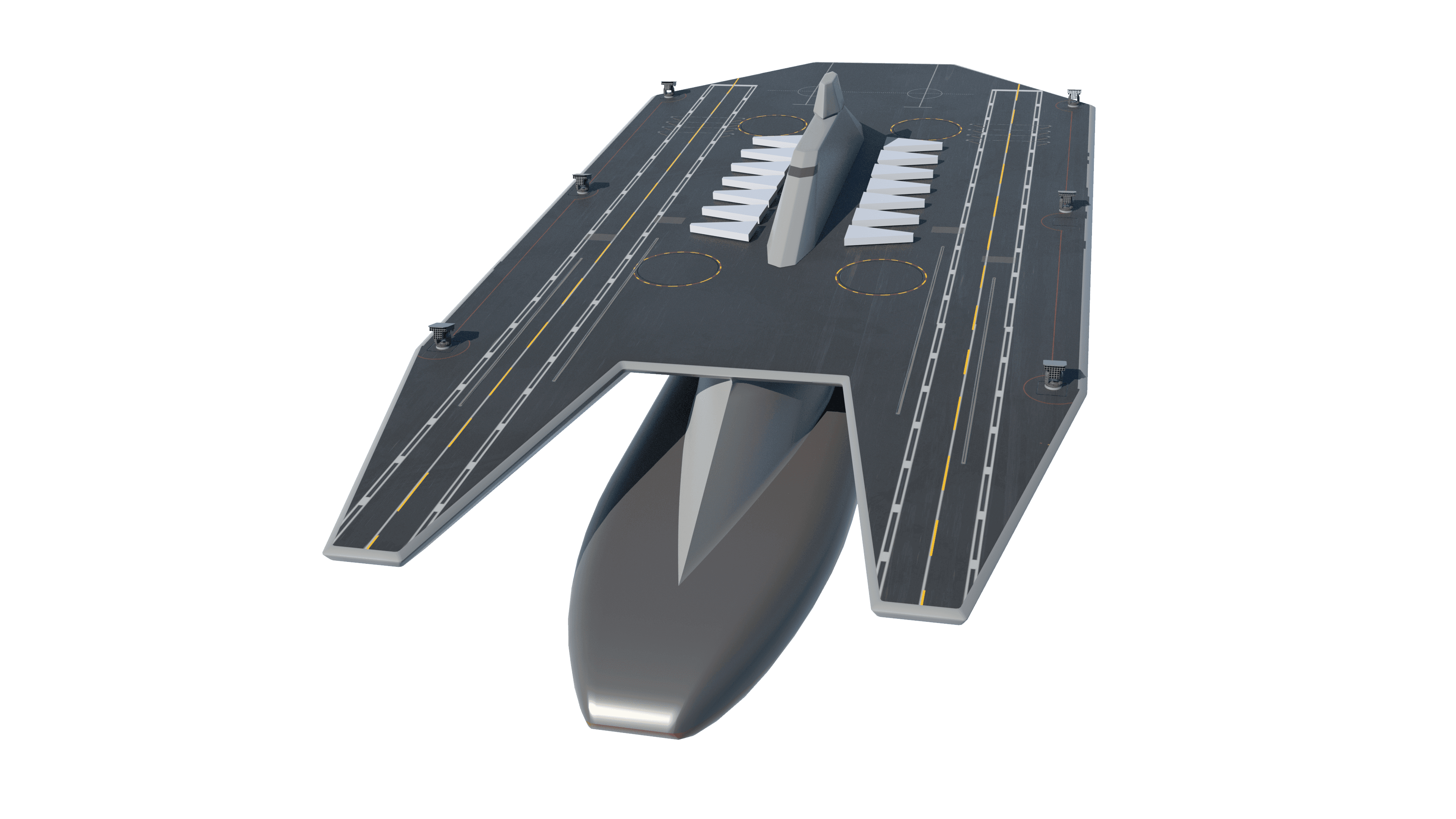 Gyro stabilized twin runway aircraft carrier. Main hull cosists of unique undersea shaping and a large-format gyrostabilizer, which enhances stability, does not require deeper water to sail. Flight deck is a completely different never-before-seen shape that is nevertheless immediately understandable as to its function