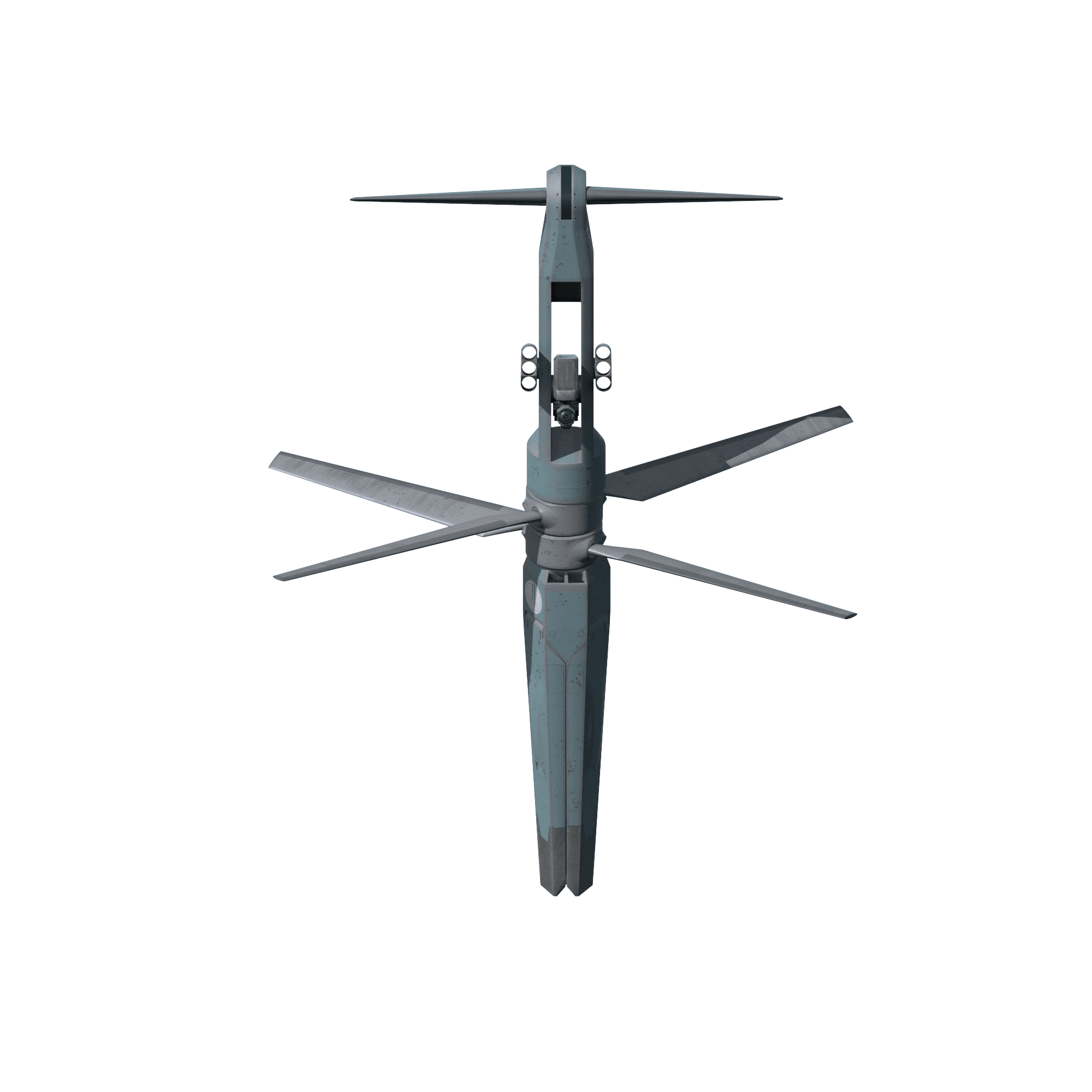 Never before seen transforming drone that can be launched and recovered from a Vertical Launch System (VLS). Coaxial center rotors and high-mounted wing offer efficient long endurance hover, and well as efficient medium cruise speed. Well inegrated pivoting weapons stations.