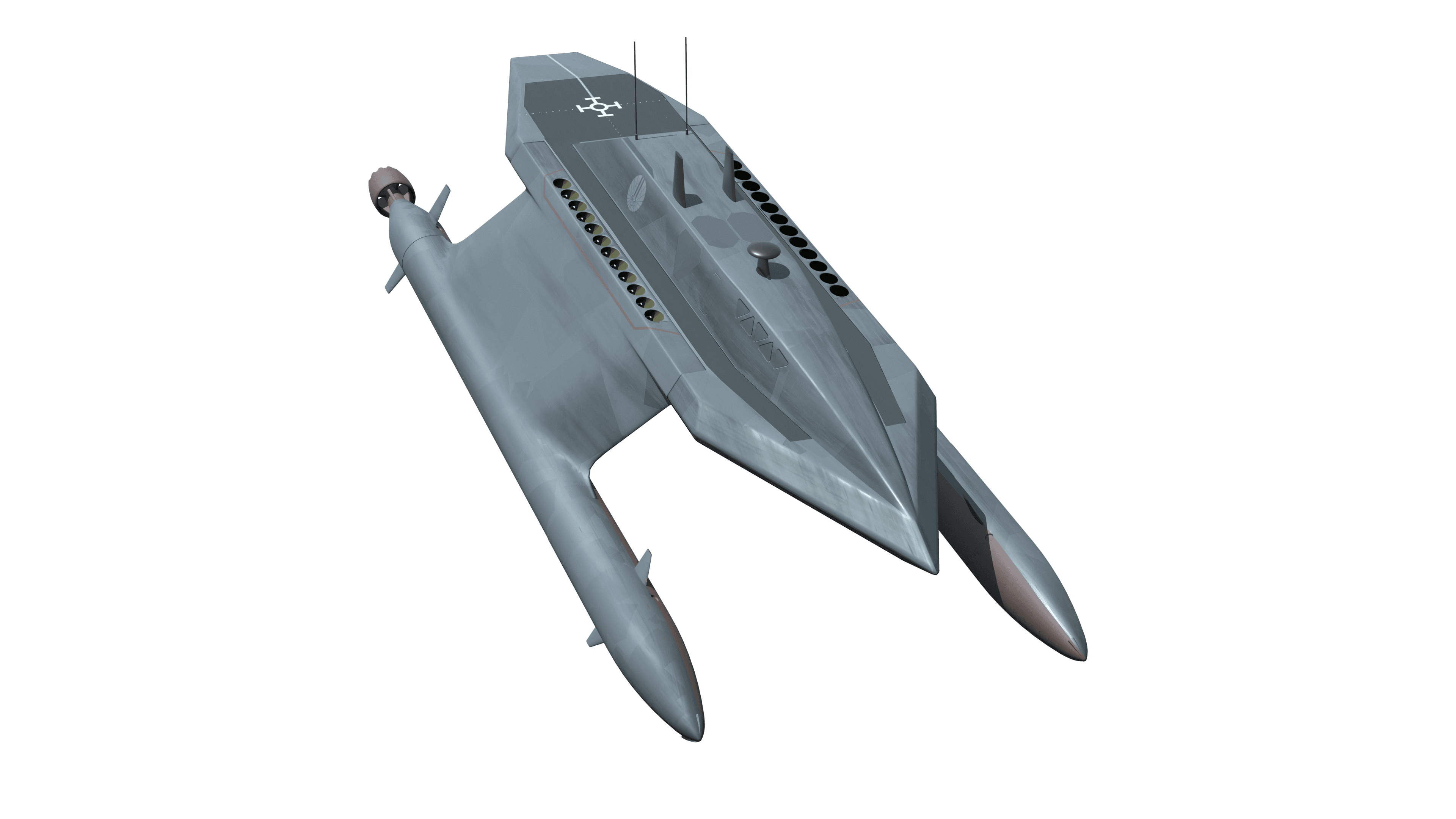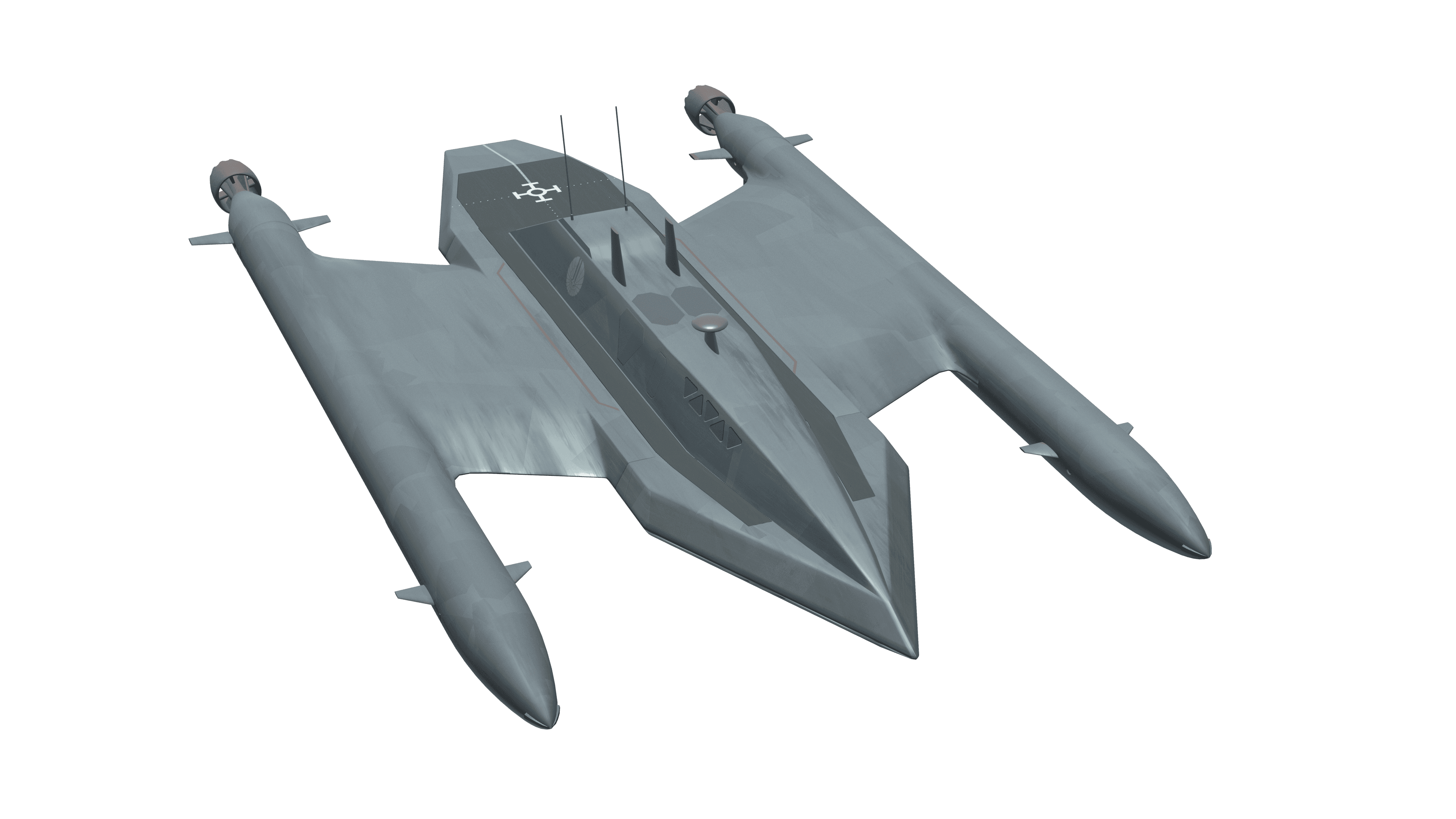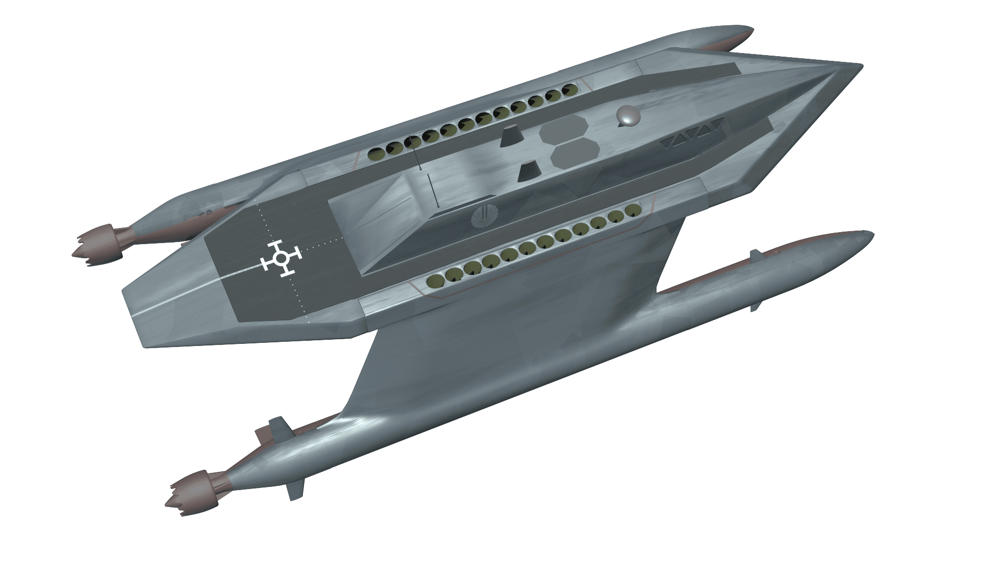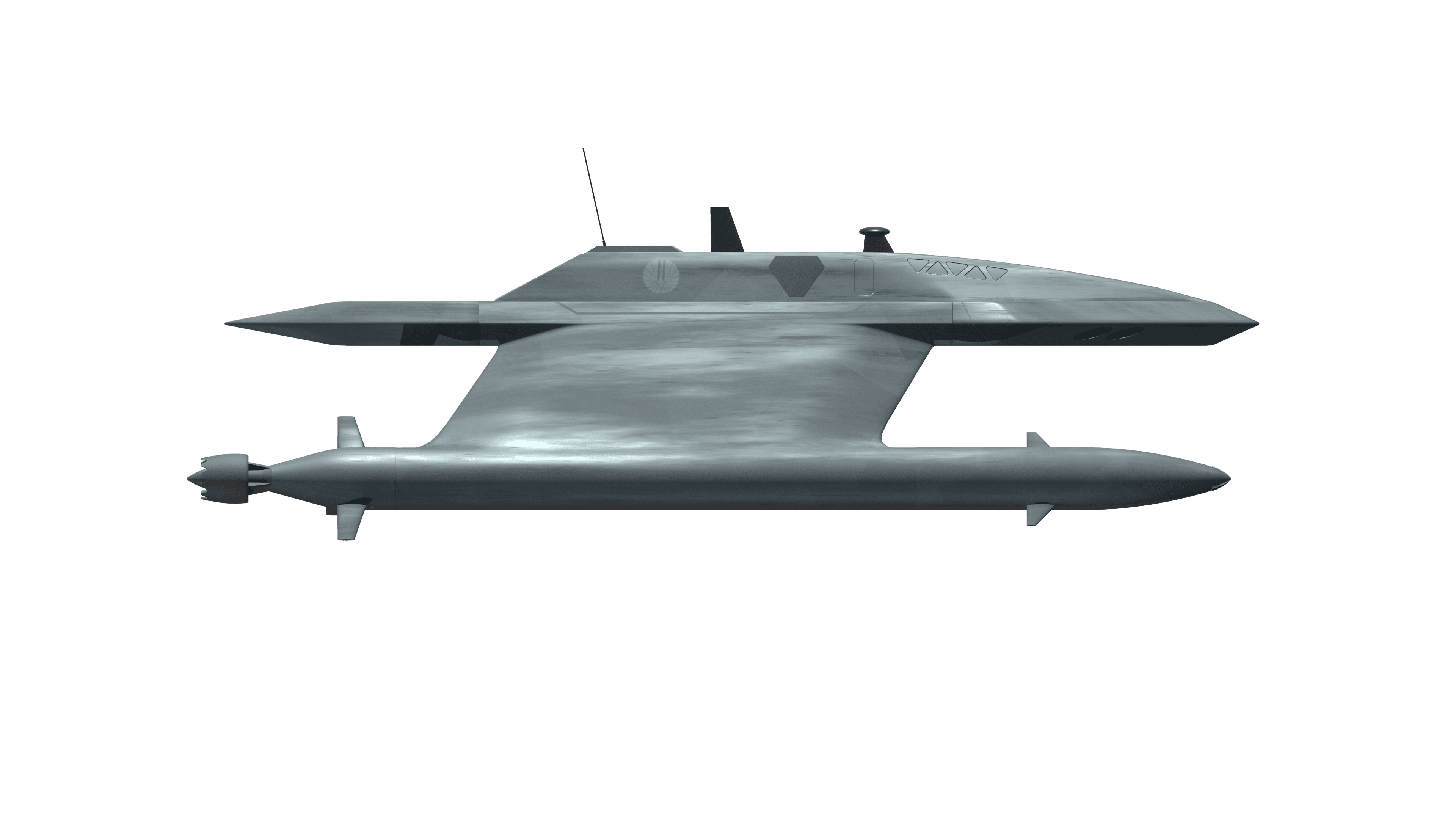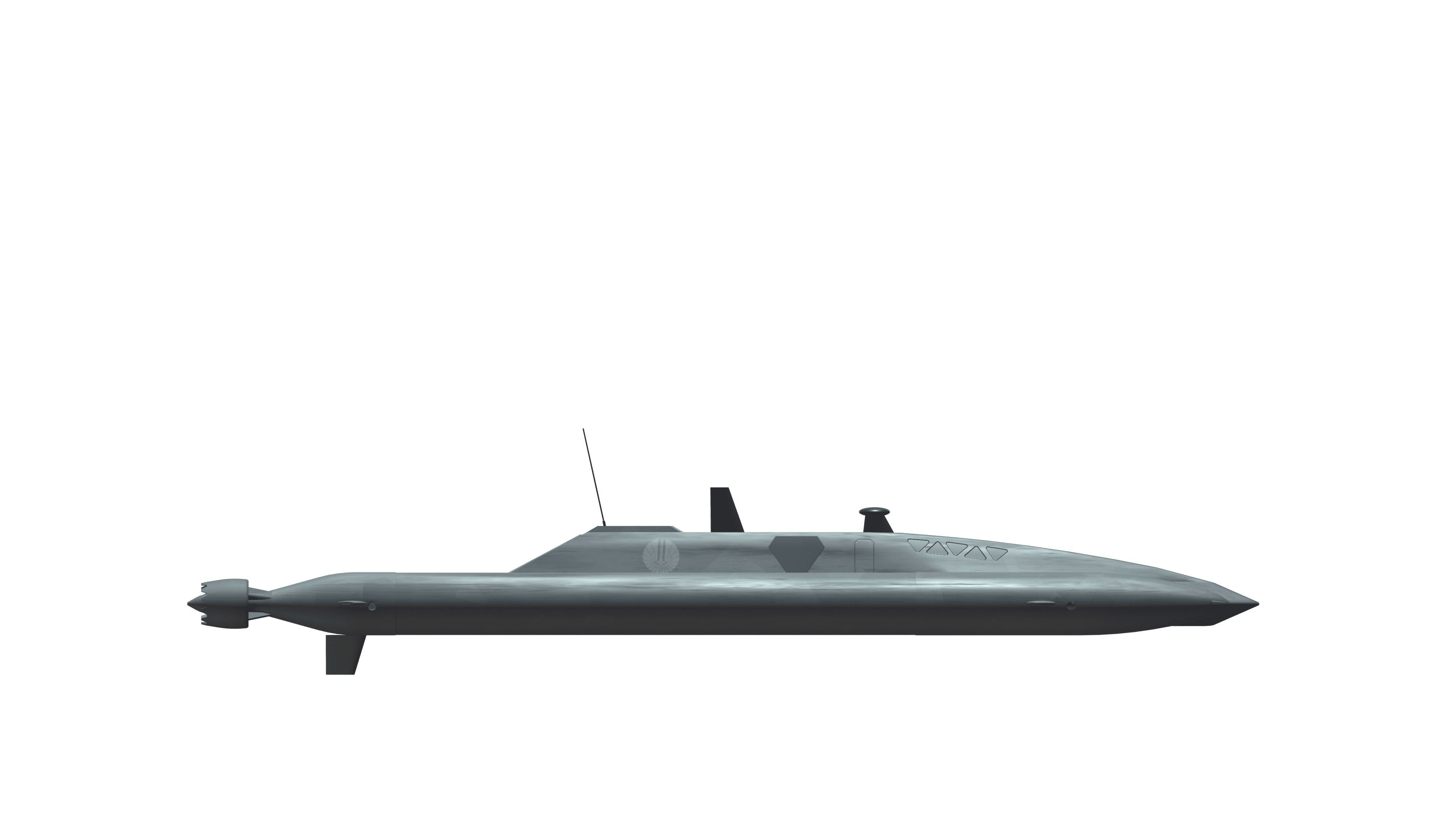 Original small-scale variable geometry submarine. Capable of transiting very shallow water or very close to sea-floor. Vertical Launch System can be utilized when normal depth water is reached.