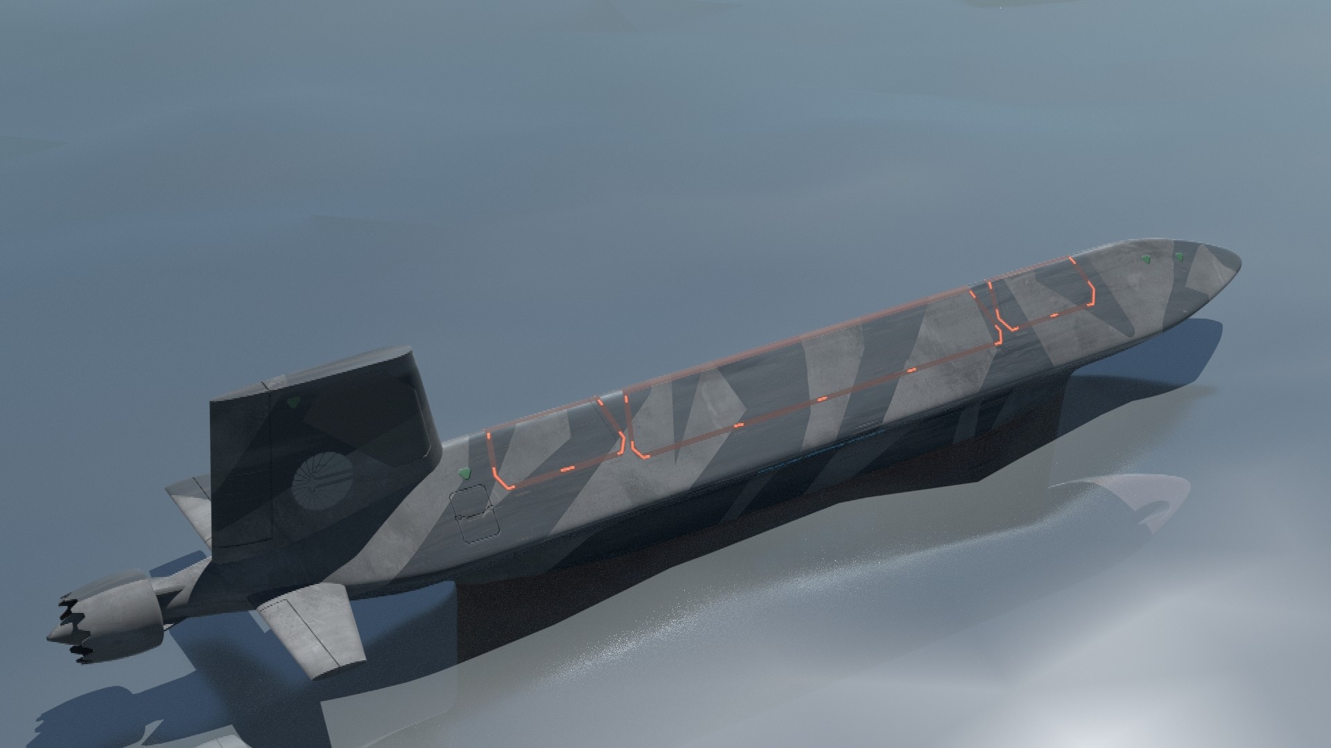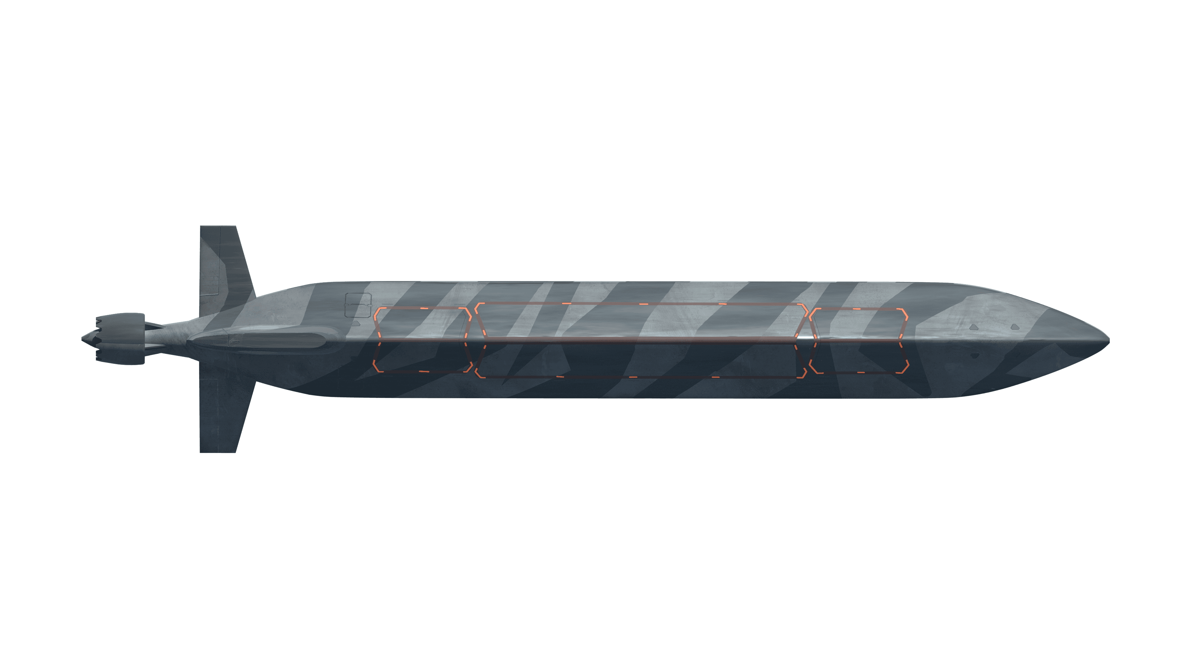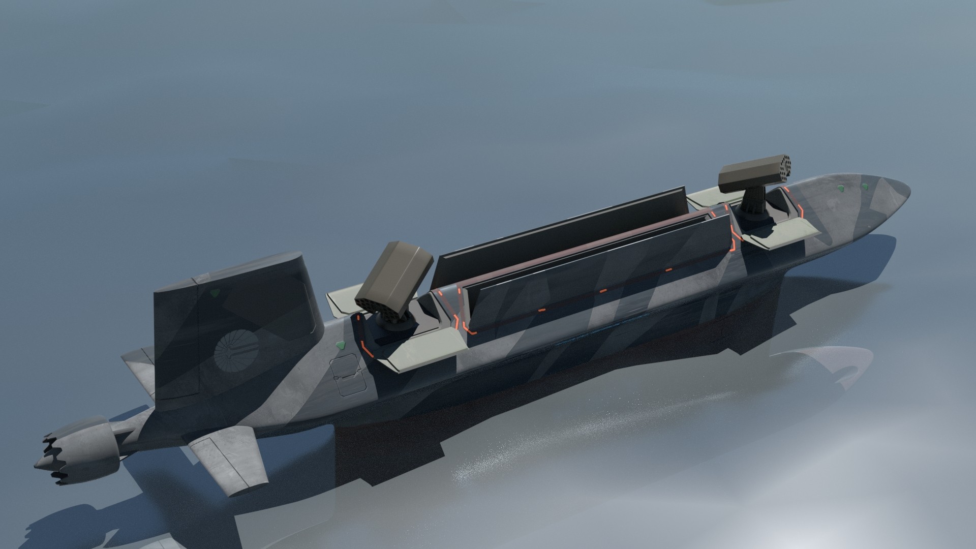 Original small-scale variable geometry submarine. Capable of transiting very shallow water or very close to sea-floor. Vertical Launch System can be utilized when normal depth water is reached.