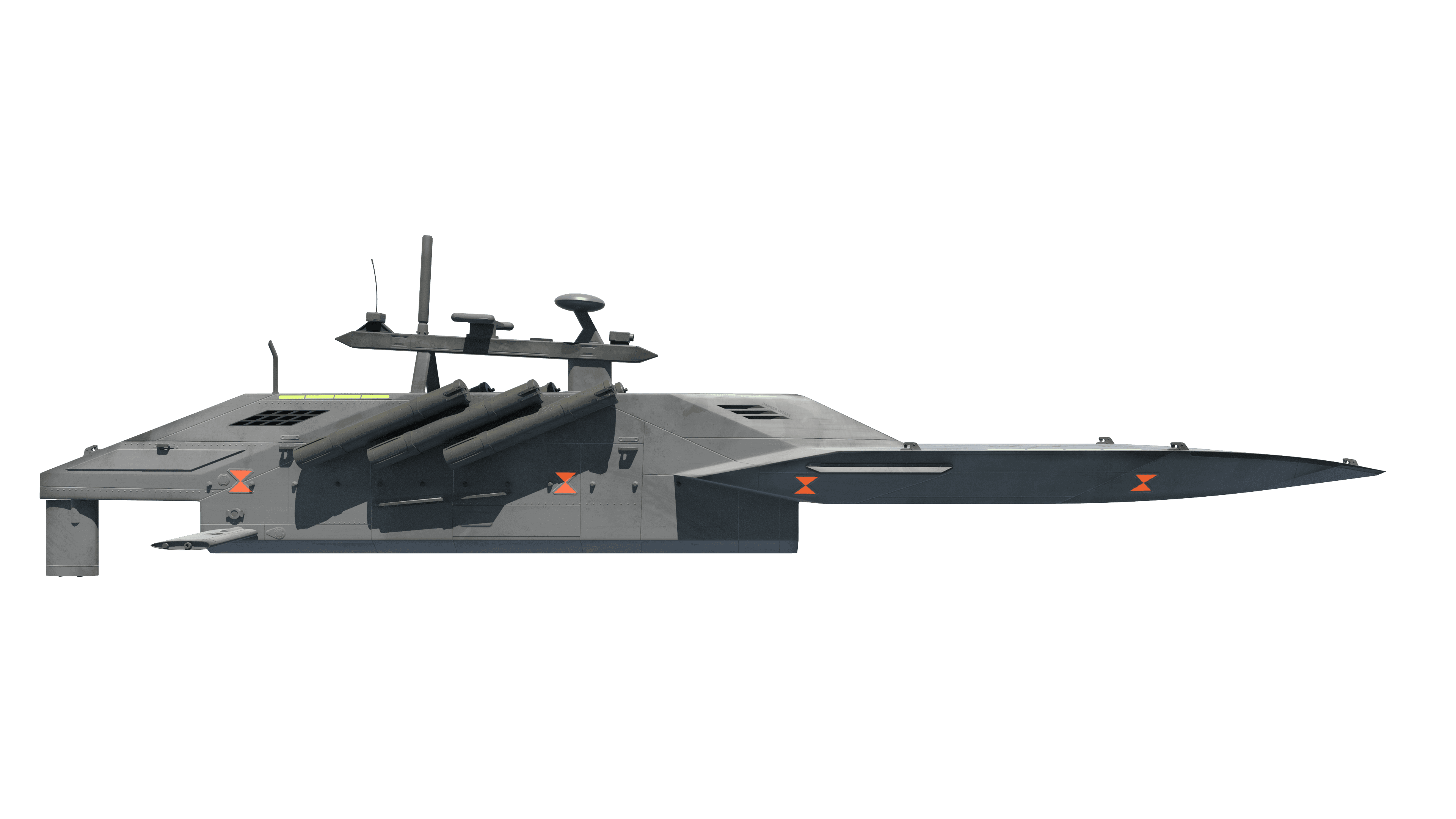 Future-forward interpretation of emerging maritime unmanned vessel technology. The most advanced Ramstorm concept, featuring a high speed hull and small flight deck for launching or serviving small drones - enhancing the range and effectiveness of both.
